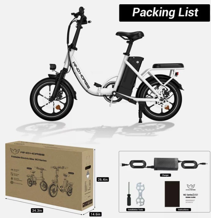 The Windhorse W2B Electric Bike is a compact, foldable, and budget-friendly e-bike designed for urban commuting, short-distance travel, and everyday convenience. With its lightweight frame and portable folding design, this bike is perfect for city riders who need a space-saving and efficient transportation solution.